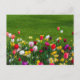 Borda de flores da primavera preenchida com tulipas e narcisos com um gramado verde exuberante.