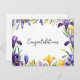 Envie sua mensagem de parabéns com este belo cartão postal. O cartão exibe um design de borda de flores roxas e amarelas da primavera, com a saudação 'Parabéns' no centro branco simples. O verso do cartão postal tem o layout tradicional para você escrever sua própria mensagem.
