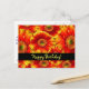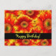 Feliz Aniversário com flores. Design floral de primavera brilhante e ousado com gerbera margaridas amarelas e laranjas brilhantes. Esta imagem vibrante e colorida contém amarelos manga brilhantes, laranja intenso e vermelhos vivos que realmente se destacam. A mensagem na frente e no verso pode ser personalizada por você. A mensagem diz, Feliz Aniversário! Desejos sinceros para um aniversário maravilhoso e que o ano que vem seja repleto de muitas coisas boas.