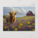 Esta pintura apresenta uma encantadora vaca Highland adornada com uma bela variedade de flores silvestres roxas e amarelas à sua volta. As cores suaves e vibrantes das flores contrastam lindamente com o pelo robusto e texturizado da vaca, evocando uma sensação serena e rústica do campo.