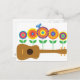 Uma imagem horizontal de um ukulele marrom, com flores estilizados e um pássaro azul que salta acima do ukulele.