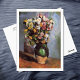 Um cartão postal de belas artes com a pintura de Paul Cezanne (1839-1906), intitulado Flores num Jar de Oliva (c. 1880). Um belo buquê de várias flores em rosa, amarelo e branco em um pote verde. Cezanne era uma artista Poste-impressionista francesa.
