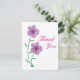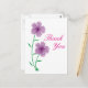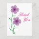 Flores roxas simples e bonito design à esquerda da carta, em fundo branco. Texto cor-de-rosa lendo "Obrigado" à direita do cartão.