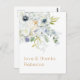 Uma maneira conveniente de enviar agradecimentos aos seus convidados após a sua festa é por cartão postal. Este design combina com outros itens da coleção, tem palavras informais sob uma cascata no topo de flores boho e folhas de eucalipto. No verso, altere para a sua mensagem ou exclua este texto se preferir escrever à mão ao recebê-lo. O texto é facilmente personalizado. Você também pode considerar nossas folhas de nomes e endereços de convidados individuais disponíveis nesta coleção para ajudar com seus envios de festa.