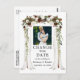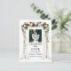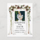 Vestido Elegante Canopy Watercolor White Brown Floral Mudança A Data de Adiamento de Casamento Nova Ficha de Casamento inclui lindas rosas brancas e flores marrons. O arco da copa do casamento da madeira inclui vegetação botânica. Foto do casal.