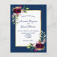 Na frente: um fundo azul e branco marinho com uma falso quadro dourado. Decorados com flores escuras e burgosas, rosas, penas e verde ao estilo do bô. Modelos para seus nomes e detalhes do casamento. Os nomes são escritos com um script de estilo manuscrito, letras ouros coloridas. Fundo branco e algumas flores.