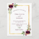 Na frente: fundo branco com falso quadro dourado. Decorados com flores escuras e burgosas, rosas, penas e verde ao estilo do bô. Personalize e adicione seus nomes e detalhes do casamento. Fundo escuro e cor de burlão. Este cartão também está disponível em nossa loja sem cor de fundo no verso.