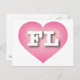 Este cartão-postal apresenta um coração cor-de-rosa vibrante com um centro lavado branco contendo as letras maiúsculas brancas em negrito FL, a abreviação oficial da Flórida, o estado do sol. O reverso do cartão postal é vazio, aguardando seus sentimentos manuscritos ou texto personalizado.