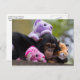 Um jovem chimpanzé abraça os seus animais de pelúcia.