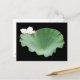 Grande folha de lótus verde acompanhada de uma floração, isolada em preto.