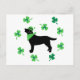 Cartão postal das Folhas de Trevo do Dia de São Patrício do Labrador Preto. Desenho da silhueta do cão Labrador Retriever preto fofo com folhas de trevo e chapéu e cachecol verdes. Arte única e engraçada do Labrador Retriever criada por Naomi Ochiai.