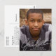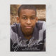 Este cartão-postal de formatura simples e moderno apresenta um fólio de prata falso sobreposto a um rótulo e uma foto completa. Na frente, "Graduado" é exibido ao longo da parte inferior em um rótulo manuscrito sobre uma grande foto vertical. Adicione o nome e a foto do graduado, o ano de formatura e a escola na frente. No verso, você pode escrever uma mensagem mais longa para os destinatários e/ou incluir detalhes da festa de formatura.