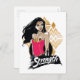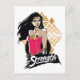Veja a Mulher Maravilha em frente ao padrão tribal do logotipo com "Força" escrita sobre um traço de pincel pintado.