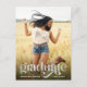 Este cartão-postal de graduação moderna apresenta uma tipografia moderna e uma grande foto. Na frente, o "Formando" é escrito em falso filme tipografia prateada na parte inferior. Abaixo, você pode adicionar o nome do formando e o ano de graduação. Na parte traseira do cartão postal de formando, você pode adicionar uma mensagem aos destinatários e/ou informações de festa de formatura.