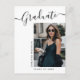 Este moderno e elegante cartão de anúncio de graduação simples, apresenta texto moderno com um roteiro elegante de caligrafia. A foto dos formandos destaca a frente do cartão, enquanto a parte traseira do cartão oferece espaços de texto personalizados para informações sobre a formatura e a viagem futura. Preto escrevendo em branco ou personalize facilmente o plano de fundo para uma cor de sua escolha. Para ver mais itens como este, visite minha loja aqui em "www.Zazzle.com/LakeViewCardCo". Obrigados