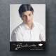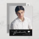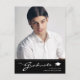 Cartaz de anúncio de graduação surpreendente, com design elementos de texto moderno fundidos com um roteiro elegante de caligrafia. A foto dos formandos destaca a frente do cartão, enquanto a parte traseira do cartão oferece espaços de texto personalizados para informações sobre a formatura e a viagem futura. Os fundos são preto e um gradiente fino na parte frontal, enquanto a parte traseira da placa tem texto preto e branco sobre um fundo de cinza prateada. Para ver mais itens como este, visite minha loja aqui em "www.Zazzle.com/LakeViewCardCo". Obrigados