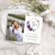 Este boho salva a data do cartão postal apresenta uma coroa circular de cor d'água roxa em um quadro circular dourado. Substitua facilmente a imagem de amostra por uma foto de vocês dois. Personalize o script elegante de escrita manual roxa com os nomes da noiva e do noivo, e o texto serif das cinzas de carvão com a data e o local. Adicione seu endereço de devolução ao fundo.