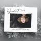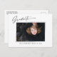 Cartões postais de anúncio de fotos modernos e elegantes, com design elementos do texto moderno com roteiro de tinta de caligrafia. A foto do formando na parte frontal da placa é realçada com uma delicada e minimalista placa de gradiente. A parte traseira do cartão oferece espaços de texto personalizados para informações sobre a sua graduação ou pode ser apagada se você quiser enviar uma mensagem. Preto e branco ou personalize facilmente o fundo para corresponder à cor primária da sua escola ou a qualquer cor da sua escolha. Perfeito para o segundo grau, universitário e estudante de formando universitário.