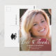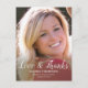 Envie um cartão postal de agradecimento elegante para sua família e amigos pelos presentes de formatura. Este design apresenta sua foto na frente com uma fonte moderna que diz "Amor & Agradecimento" em tipografia preta com seu nome, escola e turma/ano abaixo para personalizar. O verso do cartão tem uma ilustração de um chapéu de formatura e um pergaminho com uma mensagem que você pode personalizar. Criado pela artista ©Susan Coffey. Fotografia © Storytree Studios, Stanford, CA.
