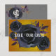 Rosas escuras e bonitas de aquarela preta com folhagem roxa decoram este elegante e moderno gótico Salvar nosso cartão de Data. O verso é uma cinza de pedra com um texto tradicional branco, adornado com um rosa preto central como quadro para sua foto de casal. Entra num reino onde os elementos góticos entram em contato com a estética moderna no nosso casamento gótico negro Salve nosso encontro. Uma celebração do amor e da escuridão aguarda, onde os espíritos dançam sob o luar e o feitiço do amor não conhece limites.