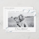 Design de folhagem botânica azul empoeirada moderna, com casal de foto, simples e elegante, informe aos seus convidados de casamento a informação atualizada com esta foto, mudando a data do cartão de adiamento do casamento, excelente para casamento moderno, casamento rústico e casamento de jardim botânico em primavera e verão.