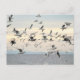 Foto original de um grande bando de gaivotas voando sobre o oceano com montanhas ao fundo.