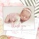 Elegante Escrito De Caligrafia Moderna Foto De Nova Menina Obrigado Cartão-Postal. Apresenta um belo texto cor-de-rosa de "obrigado" num script de letra de tipo de letra de tipo preta caligráfico escrito à mão. No lado inverso, mensagem pessoal pré-feita. Fácil de personalizar com sua foto de bebê e detalhes.