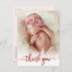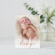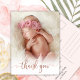 Elegante Moderna Caligrafia Rose Gold Script Foto Do Bebê Recém-Nascido Obrigado Cartão-Postal. Apresenta um belo texto de "obrigado" em um roteiro de letra de tipo maiúsculo com caligrafia manuscrito em folha de ouro rosa falso (ou folha de cor rosa pincelada). No lado inverso, mensagem pessoal pré-feita em fundo rosa-claro. Excelente para a menina. Fácil de personalizar com sua foto de bebê e detalhes.
