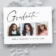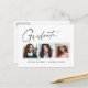 Cartões postais de anúncio de graduação "3 Fotografias" limpos, modernos e elegantes, com design de elementos do texto moderno com um único script de tinta de caligrafia. As fotos do formando são acentuadas com uma delicada e minimalista barreira de gradiente. A parte traseira do cartão oferece espaços de texto personalizados para informações sobre a sua graduação ou pode ser apagada se você quiser enviar uma mensagem. Preto e branco ou personalize facilmente o fundo para corresponder à cor primária da sua escola ou a qualquer cor da sua escolha. Perfeito para mais velho de segundos graus, universitários e universitários.