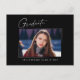 Cartões postais de anúncio de graduação "Foto" limpos, modernos e elegantes, com design elementos do texto moderno com um único roteiro de tinta de caligrafia. A foto do formando na frente da placa é realçada com uma delicada e minimalista placa de gradiente. A parte traseira do cartão oferece espaços de texto personalizados para informações sobre a sua graduação ou pode ser apagada se você quiser enviar uma mensagem. Preto e branco ou personalize facilmente o fundo para corresponder à cor primária da sua escola ou a qualquer cor da sua escolha. Perfeito para mais velho de segundos graus, universitários e universitários.