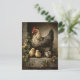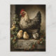 Uma pintura artística finamente detalhada de uma galinha mãe orgulhosamente vigiando seus três pintinhos, colocada em uma moldura de madeira desgastada adornada com roseiras e bagas. Este retrato enternecedor do quintal captura a ternura da maternidade e o charme rústico da vida no campo.