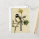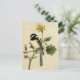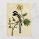 Um grão-de-bico preto e branco em greve num galho delicado, com uma flor amarela colocada sobre um creme, de fundo envelhecido. Esta impressão de safra vintage de um Frango de Longa Altura foi ilustrada na Era Vitoriana, 1862, pelo artista e ornitólogo norte-americano John Cassin.
