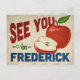 Um cartaz encantador de viagens vintage Frederick Maryland com uma adorável maçã vermelha, juntamente com um texto divertido no estilo retrô que diz, "Veja você em Frederick"