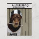 Outra fotografia fofa na série de cartões postais antropomórficos: As Aventuras de Ally, o cão Kelpie australiano. Aqui ela está vestida como prisioneira 4372 em Allycatraz, Penitenciária K9. Ela está a fazer uma pausa de 5 minutos para sair da prisão. Boa sorte, Ally! Fotógrafo: Louise Docker
