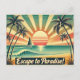 Aqui está o cartão postal de viagens vintage com uma praia tropical com palmeiras altas, ondas suaves e um veleiro a deslizar através da água. 🌴 ⛵ O sol brilhante lança um ouro brilhando sobre a cena, com matizes suaves e pastéis no céu. A tipografia ousada do estilo dos anos 50 diz "Escape to Paradise!", dando-lhe uma vibração nostálgica e inspirada na praia.