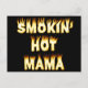 Algumas mães são tão quentes que precisam dar a conhecer ao mundo. Mas outras mães estão em um nível tão alto de calor que elas estão fumando calor e somente as chamas podem demonstrar quão marcantes elas são. Esta design é para essas mães. Diz "Fumar Mama Quente" em fogo brilhante. Se você conhece uma mãe / mãe / mãe que está nesse nível, esta é a design engraçada da mãe para você. Um cartão postal bonito para Dia de as mães, aniversário ou para dar a uma nova mãe ou a uma futura mãe gostosa.