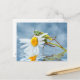 Aproximação do gafanhoto na flor da margarida, vista de perfil, acima da água sobre fundo azul nublado do céu, efeito digital