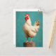 Uma pintura de óleo rústico encantadora, com um orgulhoso frango branco em pé sobre um toco de madeira com intempéries. Colocado contra um fundo turquesa angustiado com pistas de laranja, este trabalho de arte irradia charme de fazenda e personagem de safra.