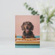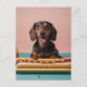 Mande um sorriso com um Cartão-Postal de Cachorro Quente. Apresentando um adorável dachshund desfrutando de um cachorro-quente, este charmoso cartão postal é perfeito para amantes de cachorros e para aqueles que apreciam saudações deliciosas e leves