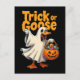 Dia de as Bruxas engraçado ganso numa fantasia fantasma assustadora com um cheio de balde de abóbora de doce. Perfeito para fãs amorosos do Halloween e pássaros maliciosos.
