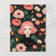 Cartão Postal Garota Adorável com Cabelo Rosa nas Flores