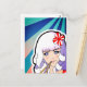 Este lindo cartão postal é um ótimo enfeite decorativo! Ilustração desenhada à mão de uma garota em estilo anime com pauzinhos na boca! O fundo é um desenho de raios solares nas cores azul, verde e laranja. Ótima arte para parede ou para enviar pelo correio!