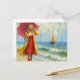 Cartão Postal Garota de vestido vermelho andando na praia na chu