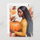 Este cartão-postal apresenta trabalho de arte de pintura a óleo de uma linda garota negra com cabelo muito comprido segurando uma abóbora em um tema de outono. Folhas de outono em castanho, laranja e vermelho completam a foto original de cores quentes. Perfeito para a época de colheita de outubro e novembro!