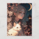 A IA gerou arte no estilo vintage de uma menina de anime com um gato branco, flores de cereja e lua crescente