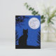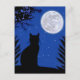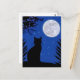 Cartão-postal numa silhueta de um gato, a olhar para uma lua de cheio num céu estrelado azul profundo