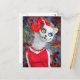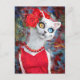 Gato branco pintado com rosas num vestido vermelho. Estilo mexicano.