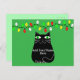 Gato de desenho gordo preto com olhos verdes. Caráter bonito de gato. Cartões postais personalizados para o Natal. Fundo verde. Editar texto para personalizar. Ideia de presente para amantes de gatos.
