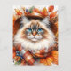Cartaz mostra um adorável gato de rag boneca vestindo um cachecol e um chapéu, cercado por folhas do outono e decor. Um delicioso retrato de cor d'água felina de outono de um gatinho de cabelos longos de olhos azuis. Excelente para amantes de gatos, mães de gatos e pais de gatos.