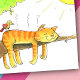 Um gato de mesa de laranja giro dorme em um galho de árvore no calor do verão. Um pássaro está sentado em suas costas e observando-o.